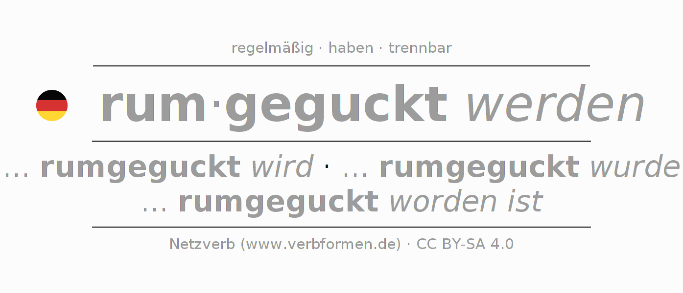 Das Konjugieren des Verbs rumgucken erfolgt regelmäßig. Die Stammformen sind ... rumgeguckt wird, ... rumgeguckt wurde und ... rumgeguckt worden ist. Als Hilfsverb von rumgucken wird "haben" verwendet. Die Vorsilbe rum- von rumgucken ist trennbar. Die Beugung erfolgt im Vorgangspassiv und die Darstellung als Nebensatz. Zum besseren Verständnis stehen unzählige Beispiele für das Verb rumgucken zur Verfügung. Zum Üben und Festigen gibt es außerdem kostenlose Arbeitsblätter für rumgucken. Man kann nicht nur rumgucken konjugieren, sondern alle deutschen Verben. Kommentare ☆