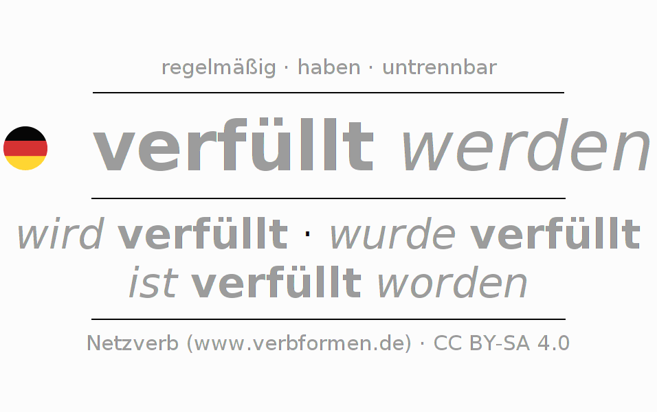 - Futur II: ich werde verfüllt worden sein, du werdest verfüllt worden sein, er werde verfüllt worden sein, wir werden verfüllt worden sein, ihr werdet verfüllt worden sein, sie werden verfüllt worden sein