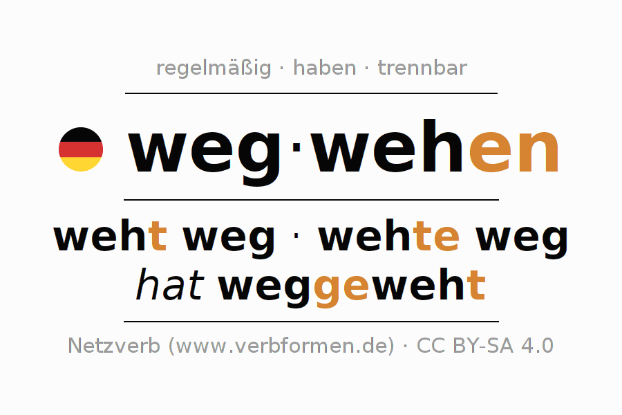 - Präsens: weh(e) (du) weg, weh(e)n wir weg, weht (ihr) weg, weh(e)n Sie weg