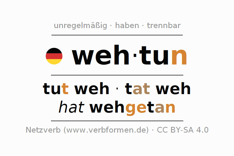 - Perfekt: ich habe wehgetan, du hast wehgetan, er hat wehgetan, wir haben wehgetan, ihr habt wehgetan, sie haben wehgetan