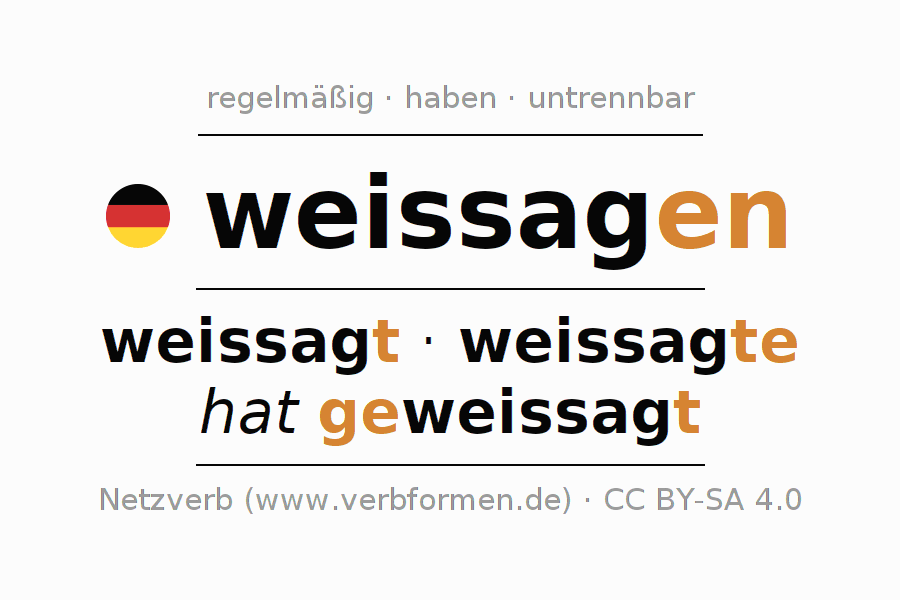 - Präsens: weissag(e) (du), weissagen wir, weissagt (ihr), weissagen Sie
