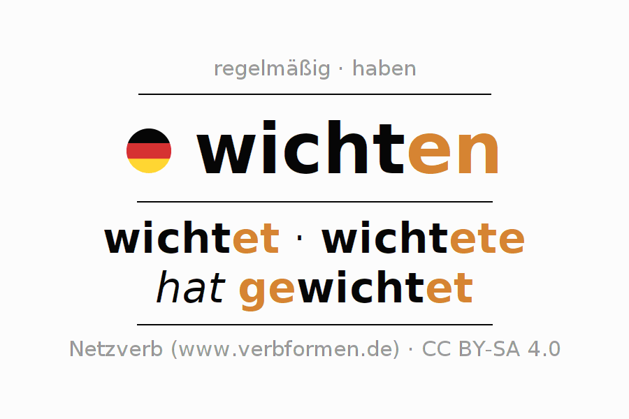 Das Konjugieren des Verbs wichten erfolgt regelmäßig. Die Stammformen sind wichtet, wichtete und hat gewichtet. Als Hilfsverb von wichten wird "haben" verwendet. Die Beugung erfolgt im Aktiv und die Darstellung als Hauptsatz. Zum besseren Verständnis stehen unzählige Beispiele für das Verb wichten zur Verfügung. Zum Üben und Festigen gibt es außerdem kostenlose Arbeitsblätter für wichten. Man kann nicht nur wichten konjugieren, sondern alle deutschen Verben. Das Verb gehört zum Wortschatz des Zertifikats Deutsch bzw. zur Stufe C2. Kommentare ☆