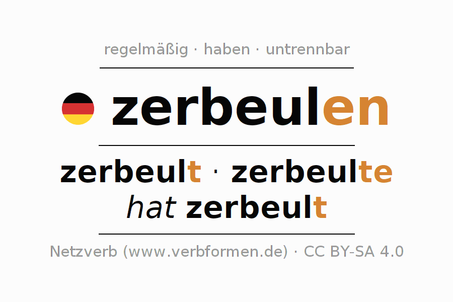 - Präsens: zerbeul(e) (du), zerbeulen wir, zerbeult (ihr), zerbeulen Sie