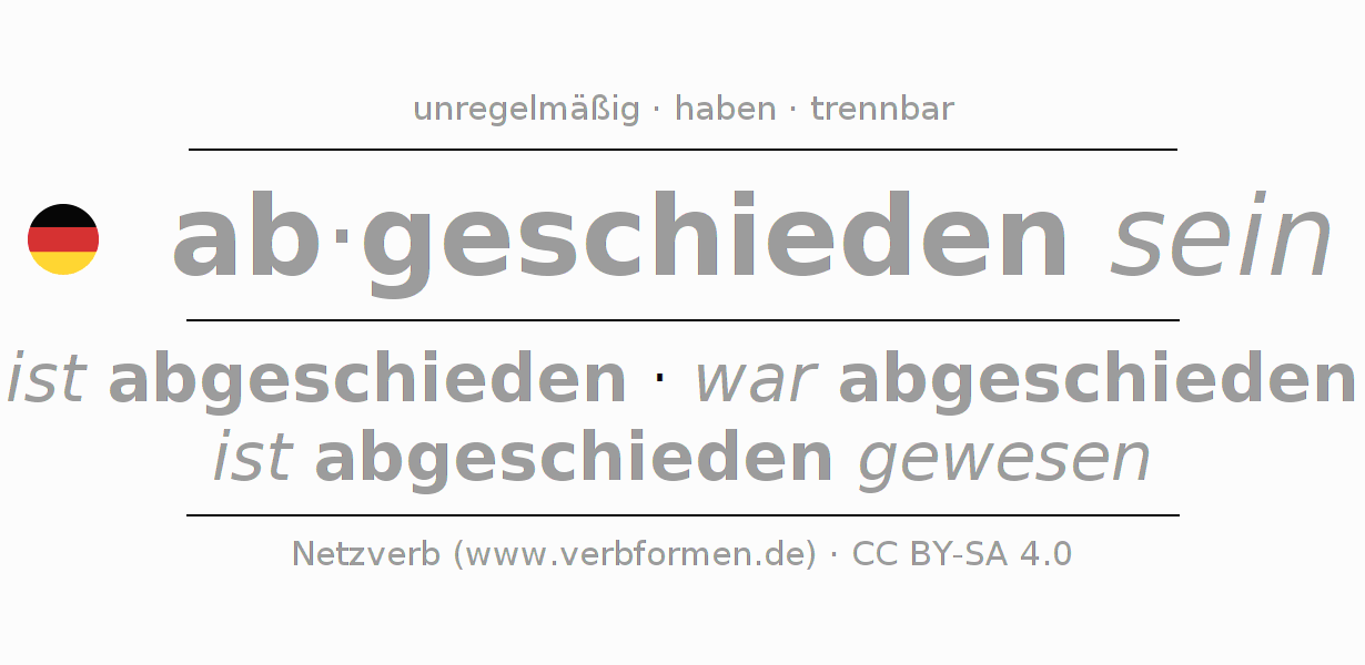 Die ab·geschieden sein Konjugation online als Verbtabelle mit allen Verbformen in Singular (Einzahl) und Plural (Mehrzahl) in allen Personen (1. Person, 2.Person, 3. Person) übersichtlich dargestellt. Die Beugung bzw. Flexion des Verbs ab·geschieden sein ist somit eine Hilfestellung für Hausaufgaben, Prüfungen, Klausuren, für den Deutschuntericht der Schule, zum Deutsch Lernen, für das Studium, Deutsch als Fremdsprache (DaZ), Deutsch als Zweitsprache (DaZ) und für die Erwachsenenbildung. Gerade auch für Deutschlernende ist die korrekte Konjugation des Verbs bzw. die korrekt flektierten Formen (ist abgeschieden - war abgeschieden - ist abgeschieden gewesen) entscheidend. Weitere Informationen finden sich unter Wiktionary abscheiden und unter abscheiden im Duden.