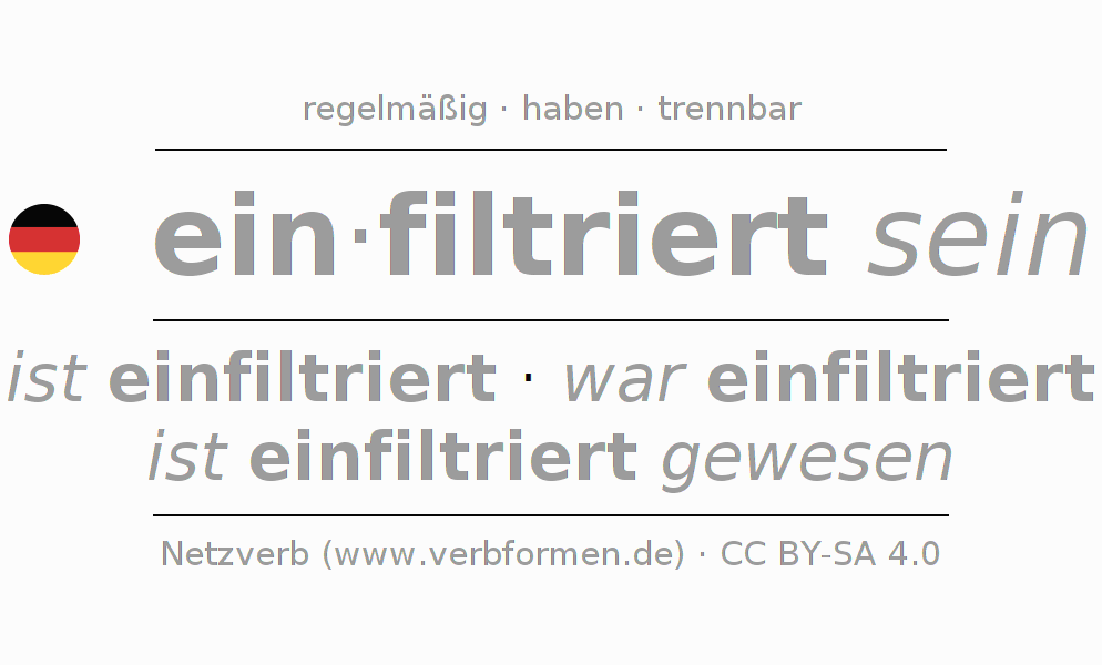 - Futur I: ich werde einfiltriert sein, du werdest einfiltriert sein, er werde einfiltriert sein, wir werden einfiltriert sein, ihr werdet einfiltriert sein, sie werden einfiltriert sein