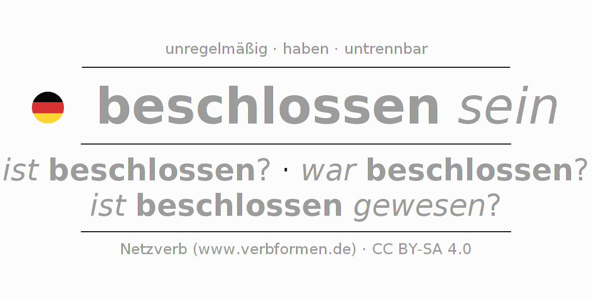 Die beschlossen sein Konjugation online als Verbtabelle mit allen Verbformen in Singular (Einzahl) und Plural (Mehrzahl) in allen Personen (1. Person, 2.Person, 3. Person) übersichtlich dargestellt. Die Beugung bzw. Flexion des Verbs beschlossen sein ist somit eine Hilfestellung für Hausaufgaben, Prüfungen, Klausuren, für den Deutschuntericht der Schule, zum Deutsch Lernen, für das Studium, Deutsch als Fremdsprache (DaZ), Deutsch als Zweitsprache (DaZ) und für die Erwachsenenbildung. Gerade auch für Deutschlernende ist die korrekte Konjugation des Verbs bzw. die korrekt flektierten Formen (ist beschlossen? - war beschlossen? - ist beschlossen gewesen?) entscheidend. Weitere Informationen finden sich unter Wiktionary beschließen und unter beschließen im Duden.