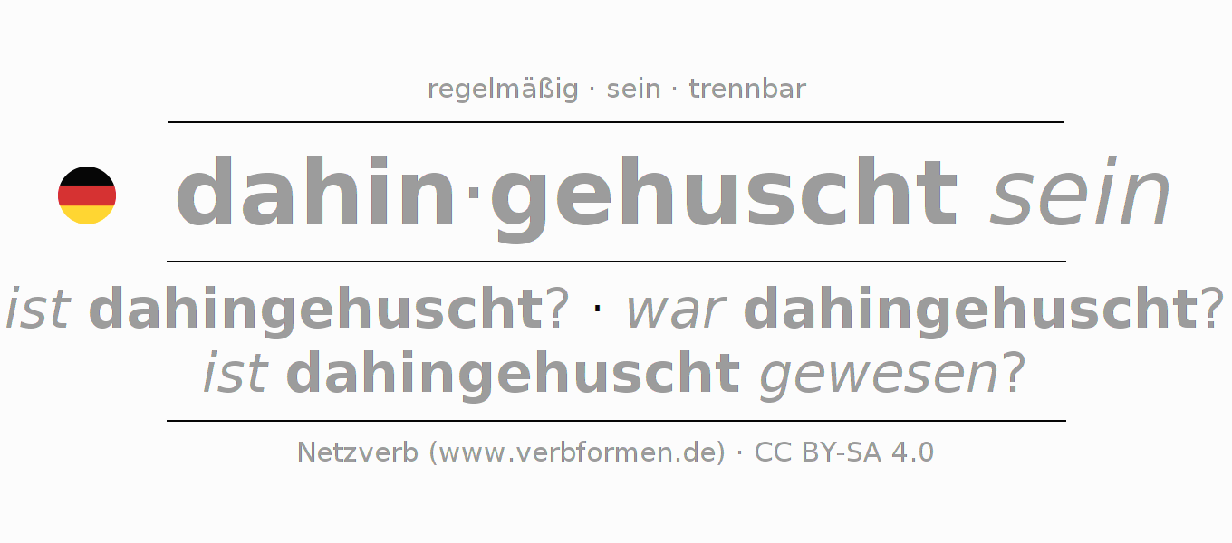 - Futur II: werde ich dahingehuscht gewesen sein?, wirst du dahingehuscht gewesen sein?, wird er dahingehuscht gewesen sein?, werden wir dahingehuscht gewesen sein?, werdet ihr dahingehuscht gewesen sein?, werden sie dahingehuscht gewesen sein?