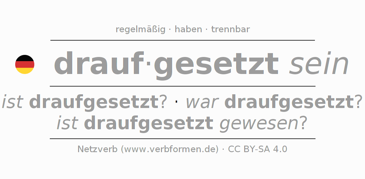 - Futur I: werde ich draufgesetzt sein?, wirst du draufgesetzt sein?, wird er draufgesetzt sein?, werden wir draufgesetzt sein?, werdet ihr draufgesetzt sein?, werden sie draufgesetzt sein?