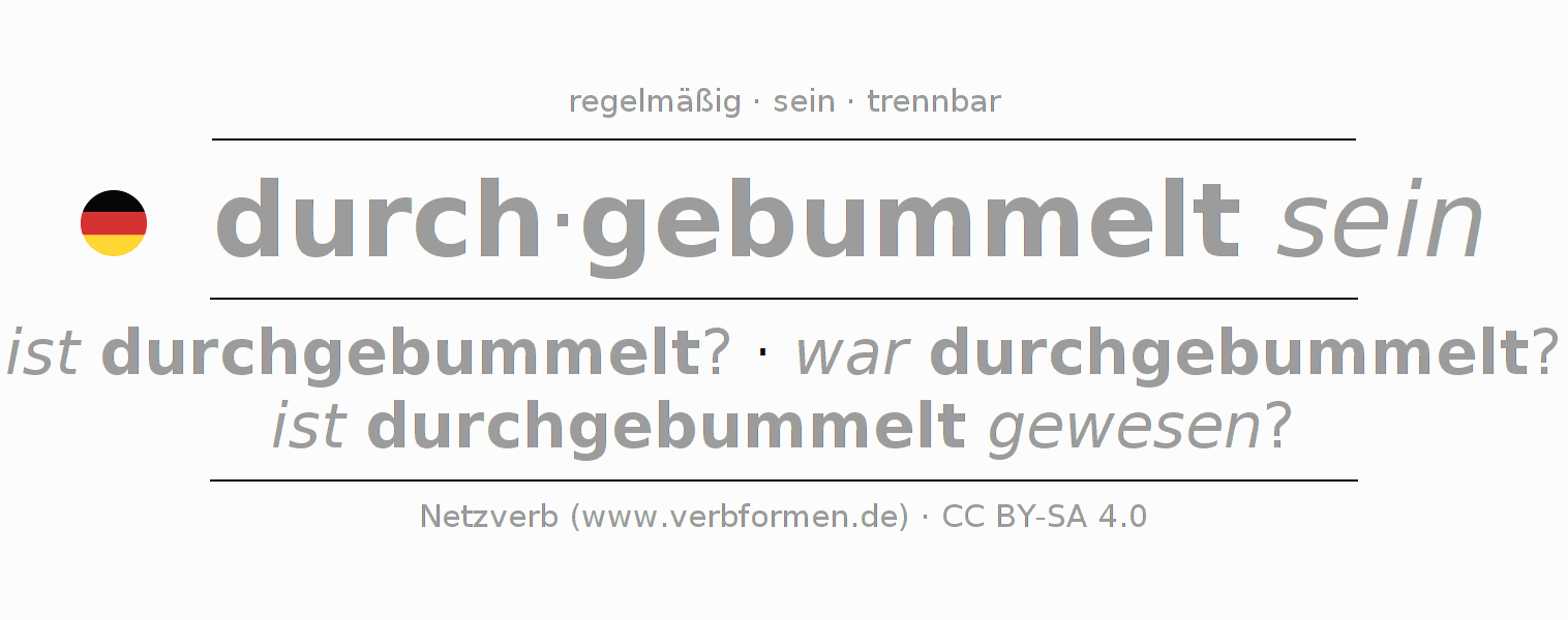 - Futur II: werde ich durchgebummelt gewesen sein?, wirst du durchgebummelt gewesen sein?, wird er durchgebummelt gewesen sein?, werden wir durchgebummelt gewesen sein?, werdet ihr durchgebummelt gewesen sein?, werden sie durchgebummelt gewesen sein?