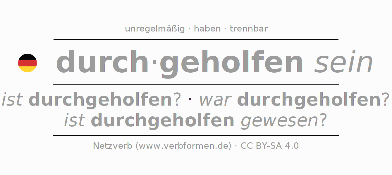- Futur II: werde ich durchgeholfen gewesen sein?, werdest du durchgeholfen gewesen sein?, werde er durchgeholfen gewesen sein?, werden wir durchgeholfen gewesen sein?, werdet ihr durchgeholfen gewesen sein?, werden sie durchgeholfen gewesen sein?