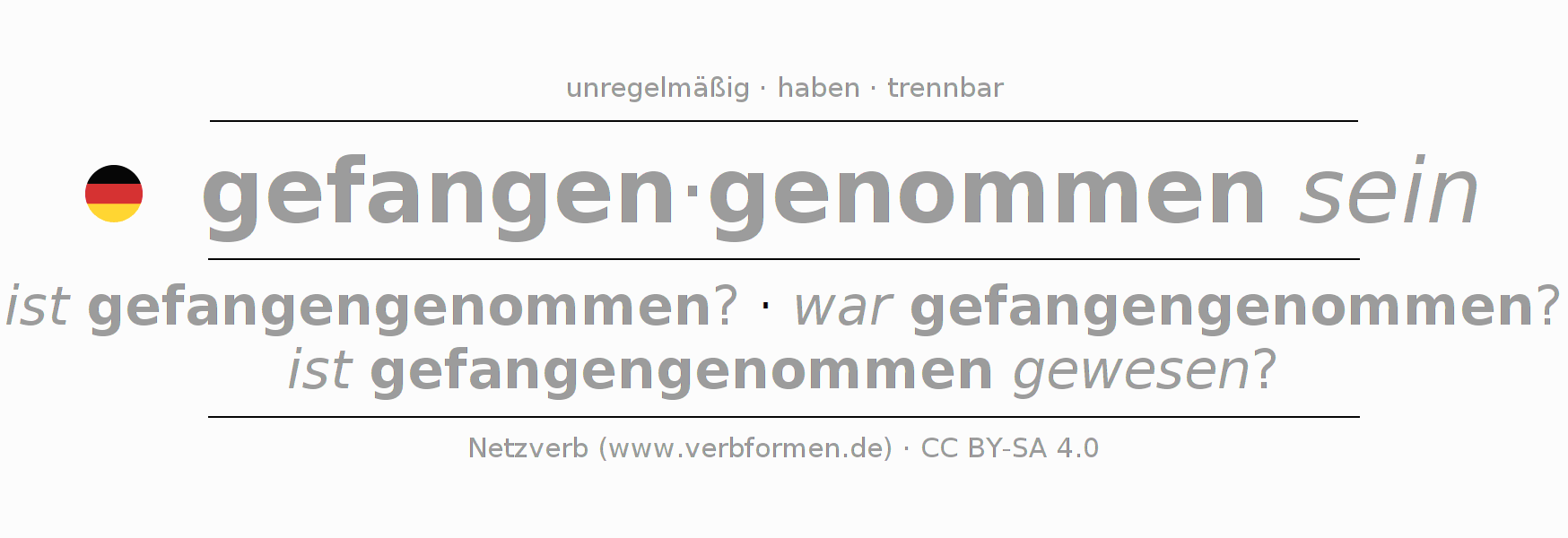 Die gefangen·genommen sein Konjugation online als Verbtabelle mit allen Verbformen in Singular (Einzahl) und Plural (Mehrzahl) in allen Personen (1. Person, 2.Person, 3. Person) übersichtlich dargestellt. Die Beugung bzw. Flexion des Verbs gefangen·genommen sein ist somit eine Hilfestellung für Hausaufgaben, Prüfungen, Klausuren, für den Deutschuntericht der Schule, zum Deutsch Lernen, für das Studium, Deutsch als Fremdsprache (DaZ), Deutsch als Zweitsprache (DaZ) und für die Erwachsenenbildung. Gerade auch für Deutschlernende ist die korrekte Konjugation des Verbs bzw. die korrekt flektierten Formen (ist gefangengenommen? - war gefangengenommen? - ist gefangengenommen gewesen?) entscheidend. Weitere Informationen finden sich unter Wiktionary gefangennehmen und unter gefangennehmen im Duden.