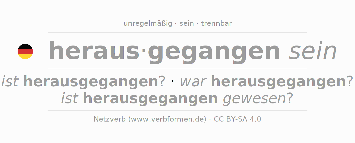 - Präsens: bin ich herausgegangen?, bist du herausgegangen?, ist er herausgegangen?, sind wir herausgegangen?, seid ihr herausgegangen?, sind sie herausgegangen?