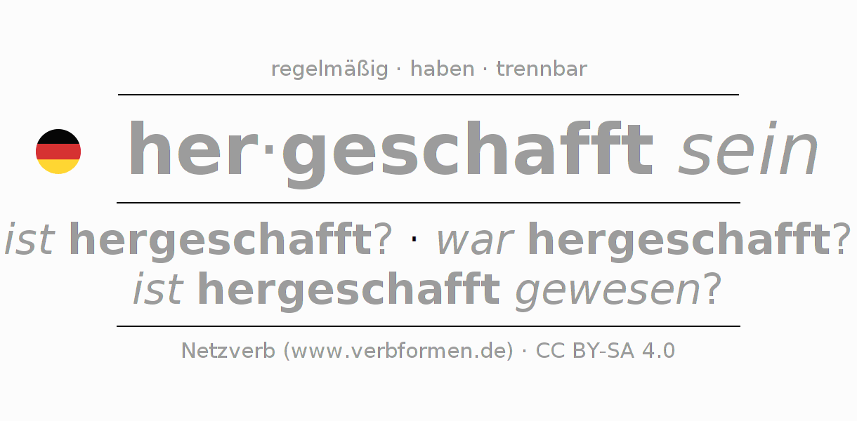 - Futur II: werde ich hergeschafft gewesen sein?, wirst du hergeschafft gewesen sein?, wird er hergeschafft gewesen sein?, werden wir hergeschafft gewesen sein?, werdet ihr hergeschafft gewesen sein?, werden sie hergeschafft gewesen sein?