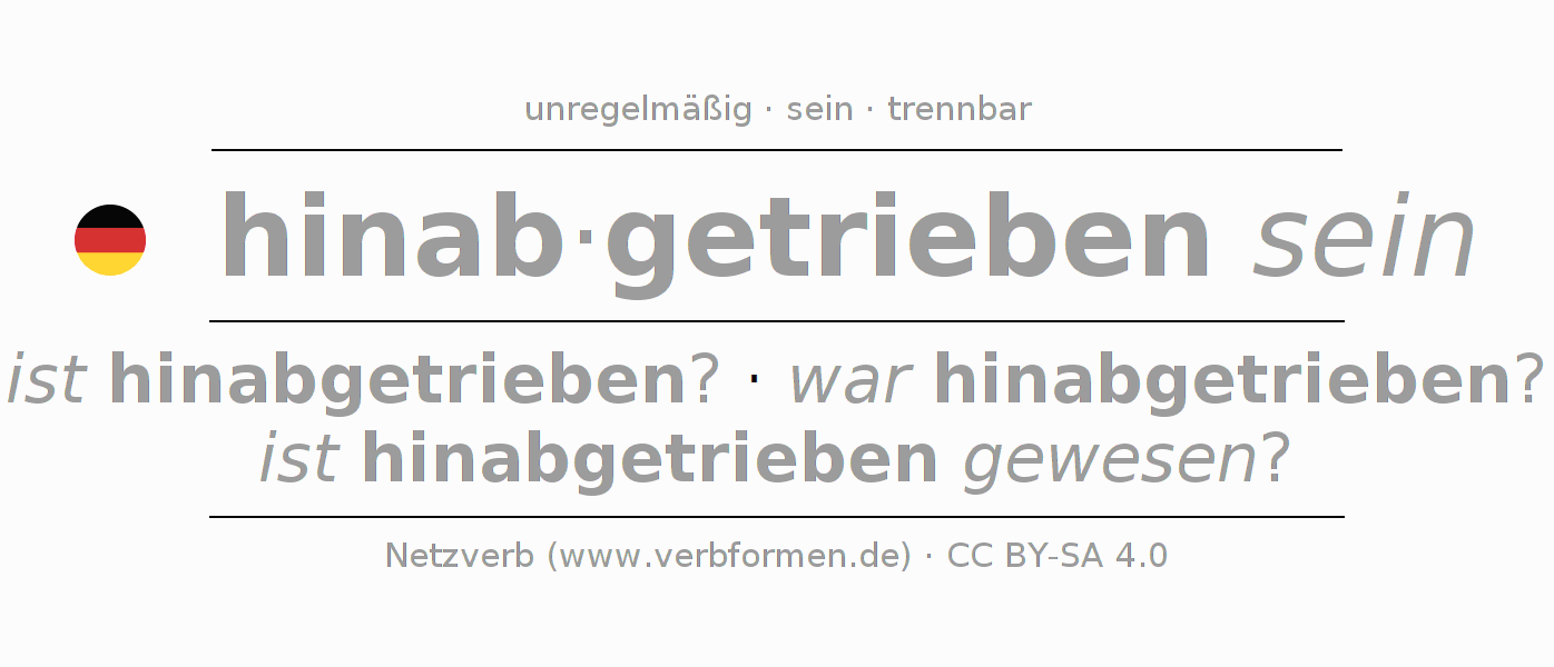 - Futur II: werde ich hinabgetrieben gewesen sein?, wirst du hinabgetrieben gewesen sein?, wird er hinabgetrieben gewesen sein?, werden wir hinabgetrieben gewesen sein?, werdet ihr hinabgetrieben gewesen sein?, werden sie hinabgetrieben gewesen sein?