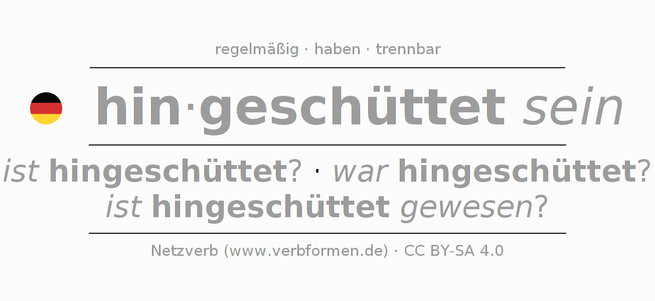 - Futur II: werde ich hingeschüttet gewesen sein?, wirst du hingeschüttet gewesen sein?, wird er hingeschüttet gewesen sein?, werden wir hingeschüttet gewesen sein?, werdet ihr hingeschüttet gewesen sein?, werden sie hingeschüttet gewesen sein?
