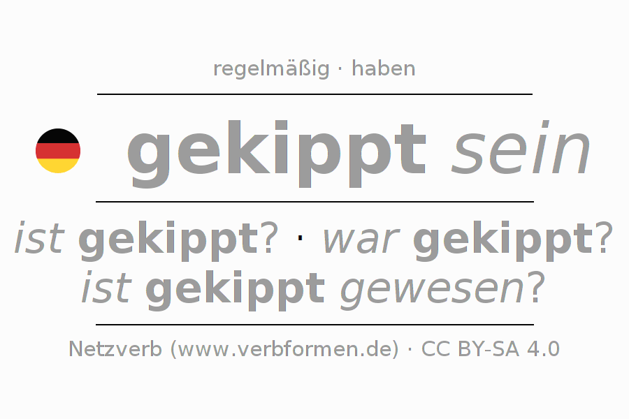 Das Konjugieren des Verbs kippen erfolgt regelmäßig. Die Stammformen sind ist gekippt?, war gekippt? und ist gekippt gewesen?. Als Hilfsverb von kippen wird "haben" verwendet. Es gibt jedoch auch Zeitformen mit dem Hilfsverb "sein". Die Beugung erfolgt im Zustandspassiv und die Darstellung als Fragesatz. Zum besseren Verständnis stehen unzählige Beispiele für das Verb kippen zur Verfügung. Zum Üben und Festigen gibt es außerdem kostenlose Arbeitsblätter für kippen. Man kann nicht nur kippen konjugieren, sondern alle deutschen Verben. Das Verb gehört zum Wortschatz des Zertifikats Deutsch bzw. zur Stufe C2. 1Kommentar ☆
