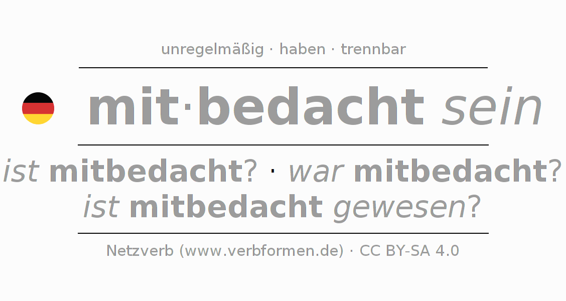 - Futur II: werde ich mitbedacht gewesen sein?, wirst du mitbedacht gewesen sein?, wird er mitbedacht gewesen sein?, werden wir mitbedacht gewesen sein?, werdet ihr mitbedacht gewesen sein?, werden sie mitbedacht gewesen sein?