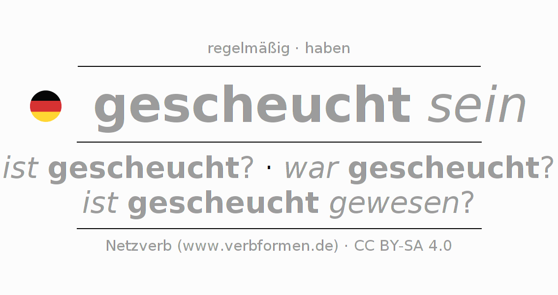 - Futur II: werde ich gescheucht gewesen sein?, wirst du gescheucht gewesen sein?, wird er gescheucht gewesen sein?, werden wir gescheucht gewesen sein?, werdet ihr gescheucht gewesen sein?, werden sie gescheucht gewesen sein?