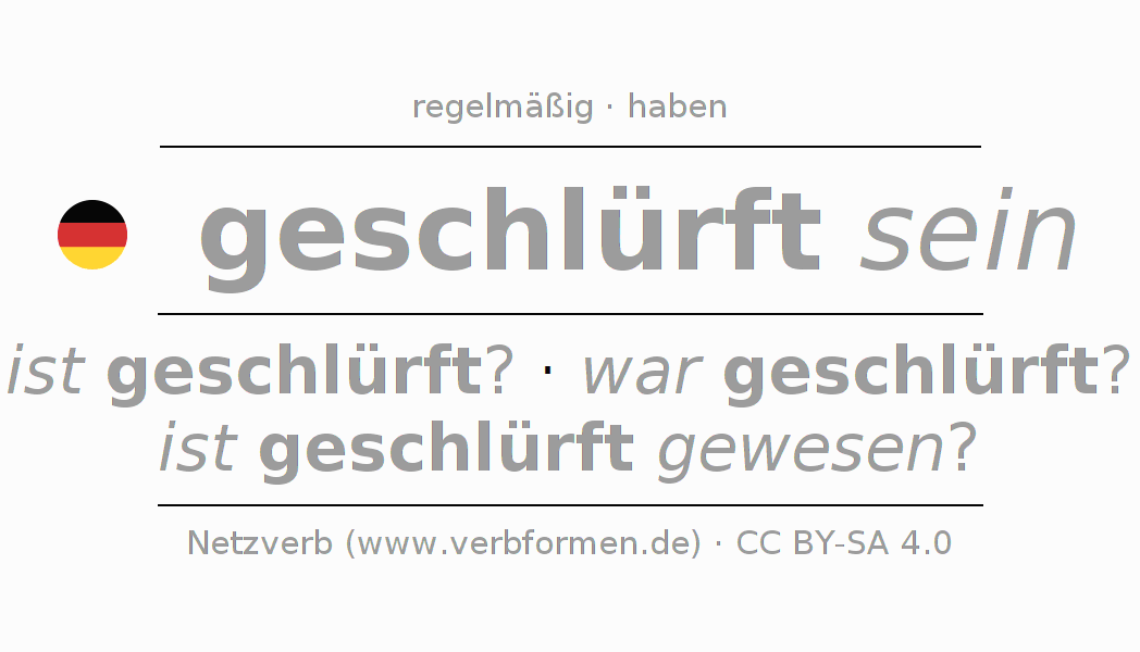 Das Konjugieren des Verbs schlürfen erfolgt regelmäßig. Die Stammformen sind ist geschlürft?, war geschlürft? und ist geschlürft gewesen?. Als Hilfsverb von schlürfen wird "haben" verwendet. Es gibt jedoch auch Zeitformen mit dem Hilfsverb "sein". Die Beugung erfolgt im Zustandspassiv und die Darstellung als Fragesatz. Zum besseren Verständnis stehen unzählige Beispiele für das Verb schlürfen zur Verfügung. Zum Üben und Festigen gibt es außerdem kostenlose Arbeitsblätter für schlürfen. Man kann nicht nur schlürfen konjugieren, sondern alle deutschen Verben. Das Verb gehört zum Wortschatz des Zertifikats Deutsch bzw. zur Stufe A2. Kommentare ☆