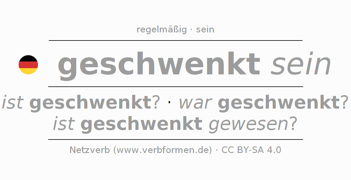 - Futur I: werde ich geschwenkt sein?, wirst du geschwenkt sein?, wird er geschwenkt sein?, werden wir geschwenkt sein?, werdet ihr geschwenkt sein?, werden sie geschwenkt sein?