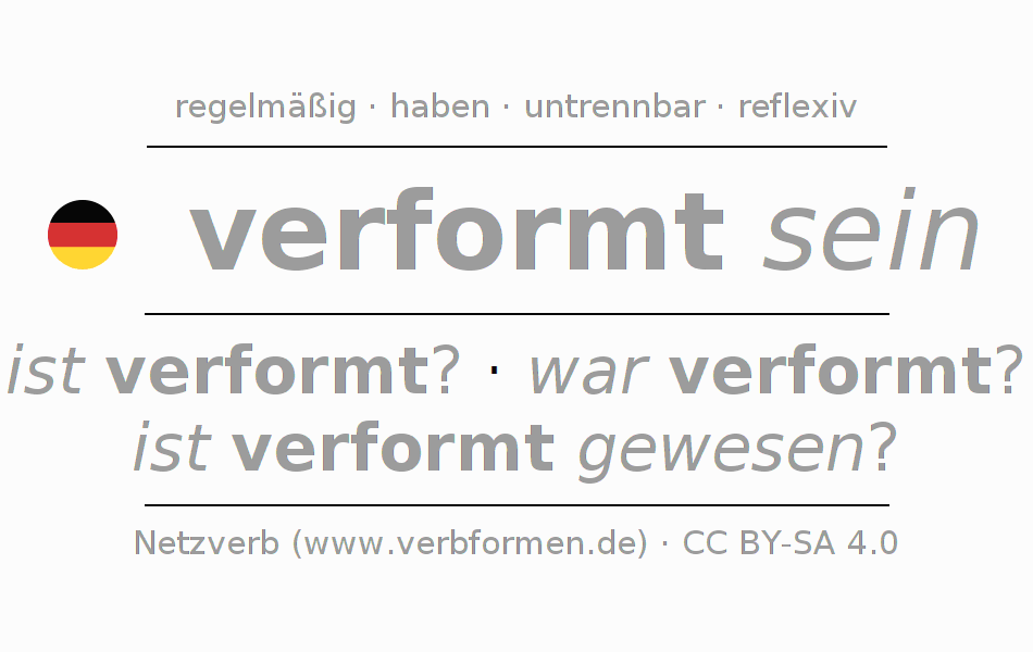 - Futur II: werde ich verformt gewesen sein?, werdest du verformt gewesen sein?, werde er verformt gewesen sein?, werden wir verformt gewesen sein?, werdet ihr verformt gewesen sein?, werden sie verformt gewesen sein?
