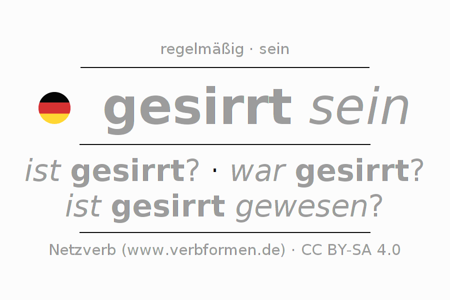 - Perfekt: bin ich gesirrt gewesen?, bist du gesirrt gewesen?, ist er gesirrt gewesen?, sind wir gesirrt gewesen?, seid ihr gesirrt gewesen?, sind sie gesirrt gewesen?