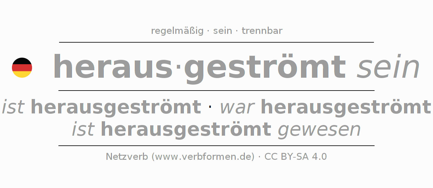 Das Konjugieren des Verbs herausströmen erfolgt regelmäßig. Die Stammformen sind ist herausgeströmt, war herausgeströmt und ist herausgeströmt gewesen. Als Hilfsverb von herausströmen wird "sein" verwendet. Die Vorsilbe heraus- von herausströmen ist trennbar. Die Beugung erfolgt im Zustandspassiv und die Darstellung als Hauptsatz. Zum besseren Verständnis stehen unzählige Beispiele für das Verb herausströmen zur Verfügung. Zum Üben und Festigen gibt es außerdem kostenlose Arbeitsblätter für herausströmen. Man kann nicht nur herausströmen konjugieren, sondern alle deutschen Verben. Kommentare ☆
