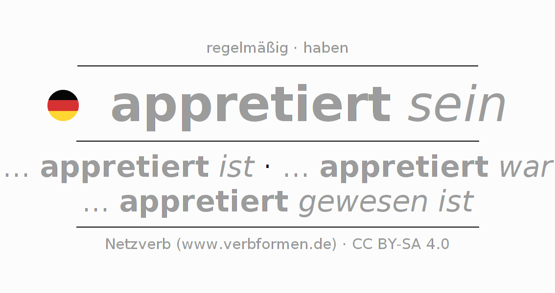 - Präsens: ... ich appretiert bin, ... du appretiert bist, ... er appretiert ist, ... wir appretiert sind, ... ihr appretiert seid, ... sie appretiert sind