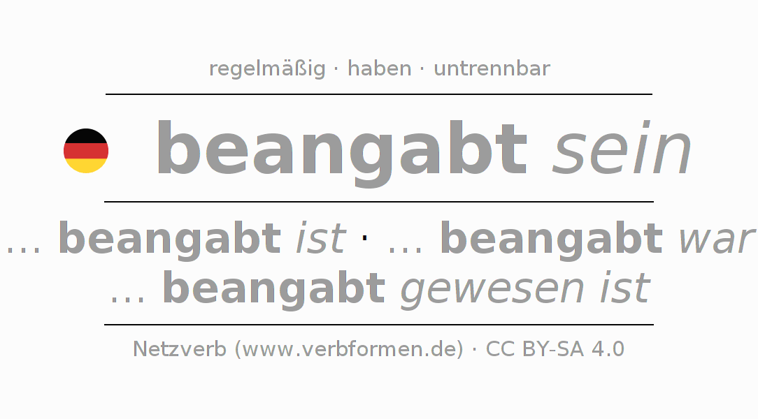 - Futur I: ... ich beangabt sein werde, ... du beangabt sein werdest, ... er beangabt sein werde, ... wir beangabt sein werden, ... ihr beangabt sein werdet, ... sie beangabt sein werden