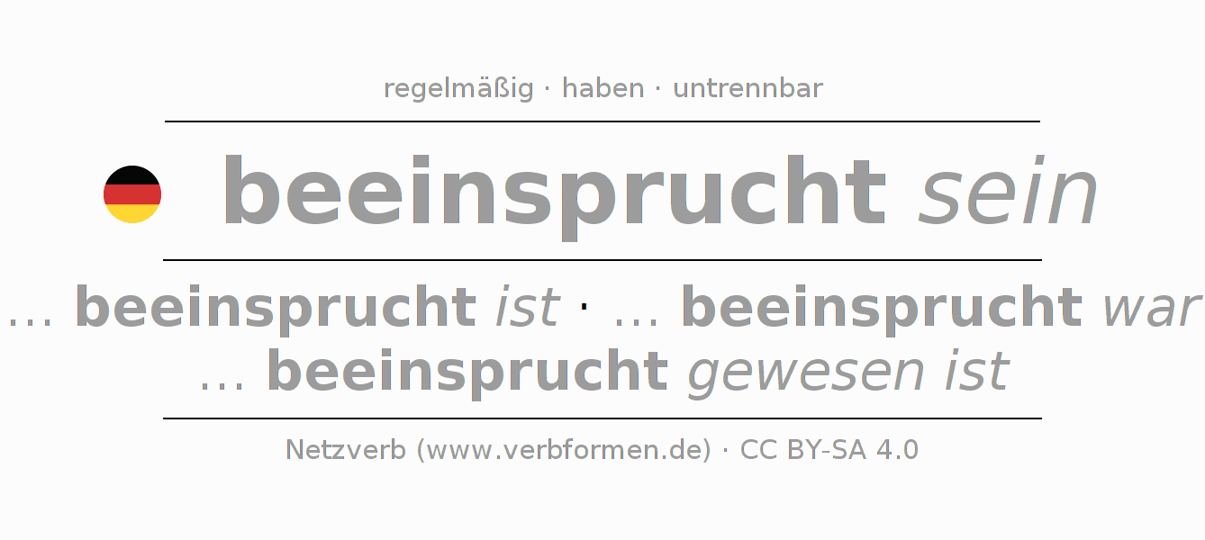 - Futur II: ... ich beeinsprucht gewesen sein werde, ... du beeinsprucht gewesen sein wirst, ... er beeinsprucht gewesen sein wird, ... wir beeinsprucht gewesen sein werden, ... ihr beeinsprucht gewesen sein werdet, ... sie beeinsprucht gewesen sein werden