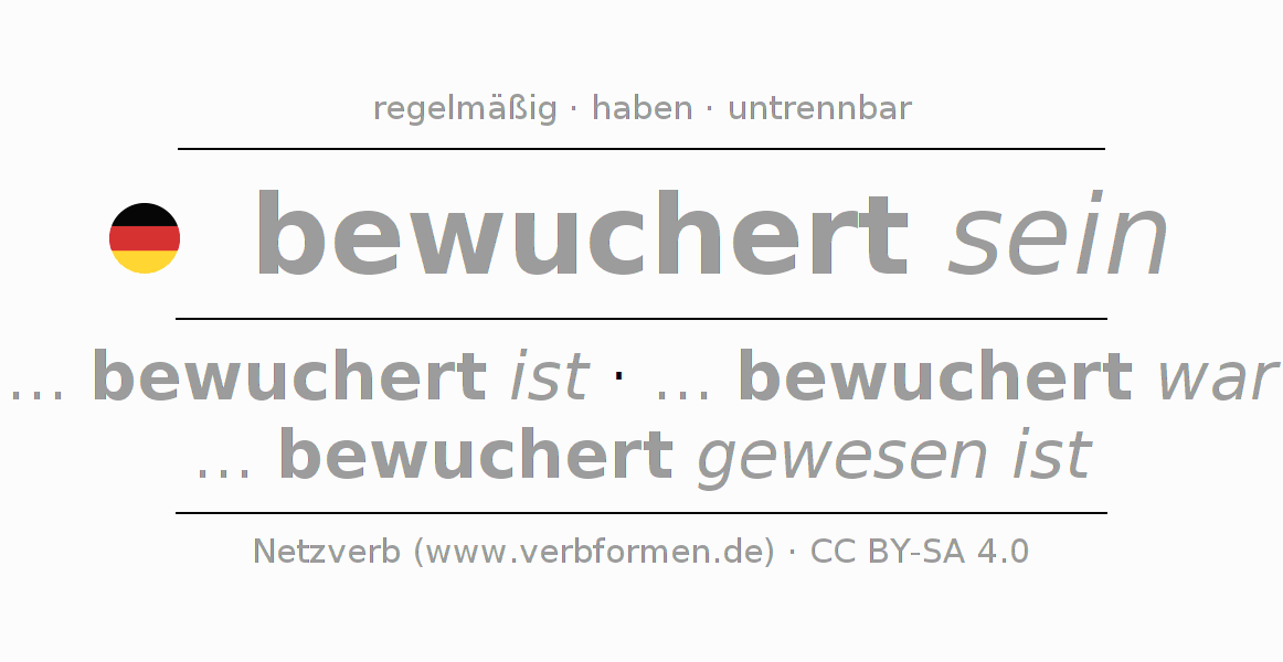 - Futur II: ... ich bewuchert gewesen sein werde, ... du bewuchert gewesen sein wirst, ... er bewuchert gewesen sein wird, ... wir bewuchert gewesen sein werden, ... ihr bewuchert gewesen sein werdet, ... sie bewuchert gewesen sein werden
