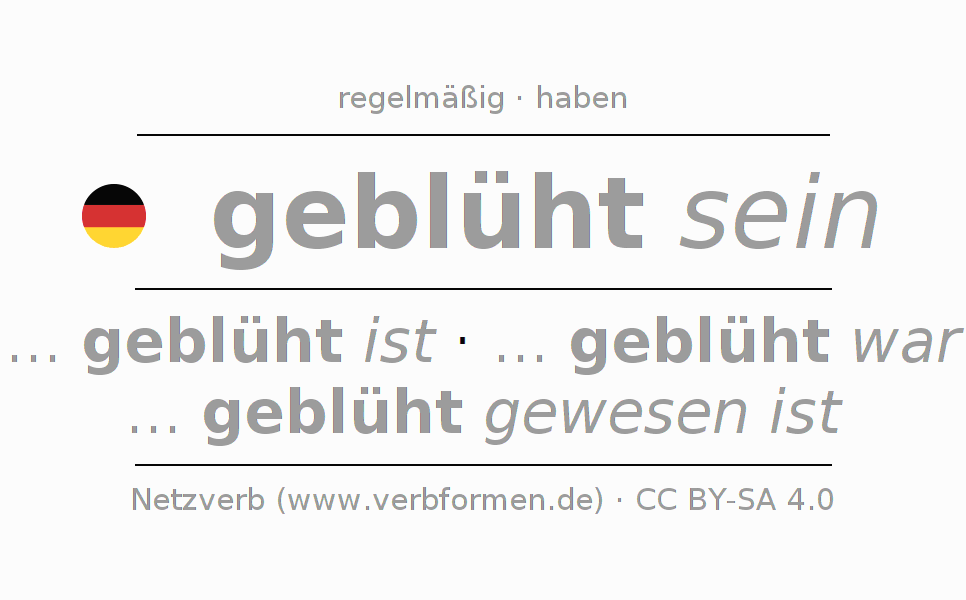 - Futur II: ... ich geblüht gewesen sein werde, ... du geblüht gewesen sein wirst, ... er geblüht gewesen sein wird, ... wir geblüht gewesen sein werden, ... ihr geblüht gewesen sein werdet, ... sie geblüht gewesen sein werden