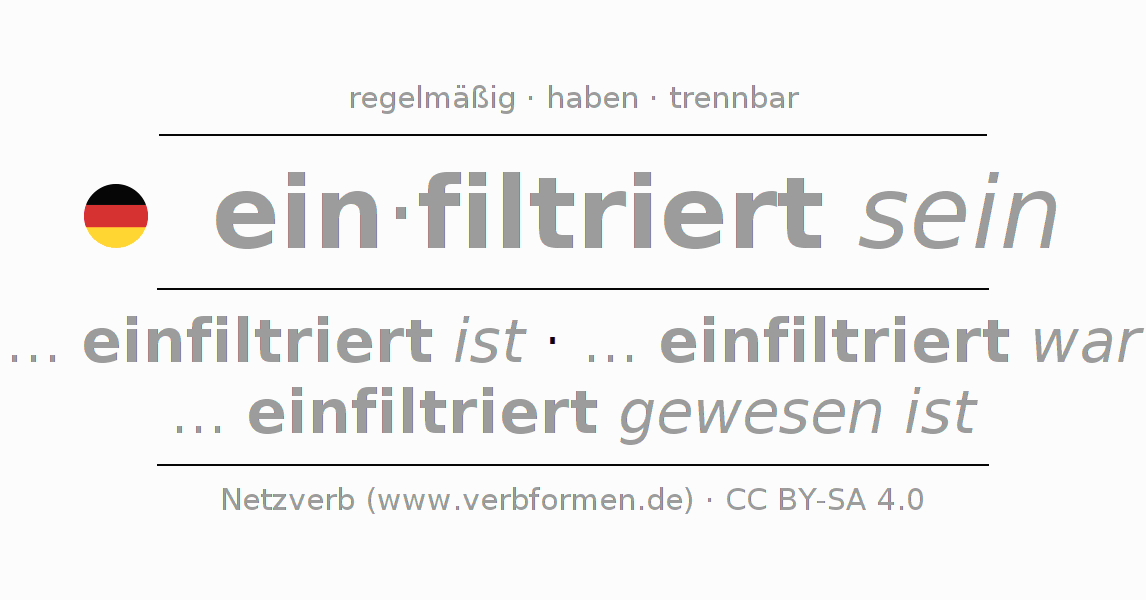 - Futur I: ... ich einfiltriert sein werde, ... du einfiltriert sein wirst, ... er einfiltriert sein wird, ... wir einfiltriert sein werden, ... ihr einfiltriert sein werdet, ... sie einfiltriert sein werden