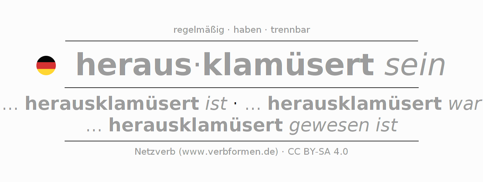 - Futur I: ... ich herausklamüsert sein werde, ... du herausklamüsert sein wirst, ... er herausklamüsert sein wird, ... wir herausklamüsert sein werden, ... ihr herausklamüsert sein werdet, ... sie herausklamüsert sein werden