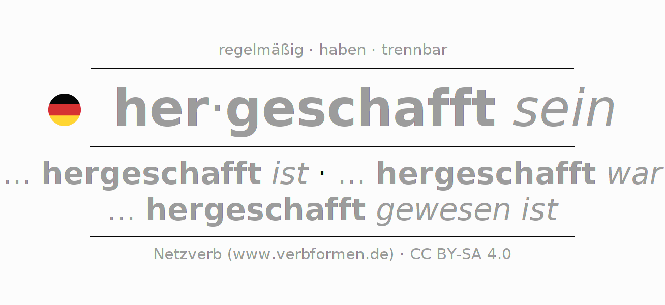 - Futur I: ... ich hergeschafft sein werde, ... du hergeschafft sein wirst, ... er hergeschafft sein wird, ... wir hergeschafft sein werden, ... ihr hergeschafft sein werdet, ... sie hergeschafft sein werden