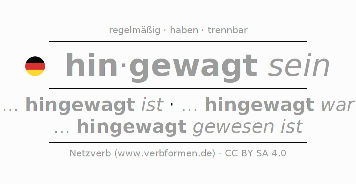 - Futur I: ... ich hingewagt sein werde, ... du hingewagt sein werdest, ... er hingewagt sein werde, ... wir hingewagt sein werden, ... ihr hingewagt sein werdet, ... sie hingewagt sein werden