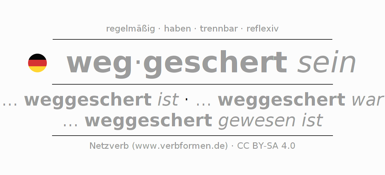 - Futur I: ... ich weggeschert sein werde, ... du weggeschert sein wirst, ... er weggeschert sein wird, ... wir weggeschert sein werden, ... ihr weggeschert sein werdet, ... sie weggeschert sein werden