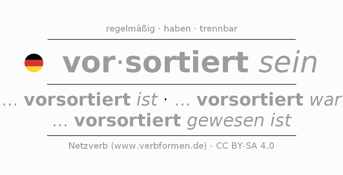 Die vor·sortiert sein Konjugation online als Verbtabelle mit allen Verbformen in Singular (Einzahl) und Plural (Mehrzahl) in allen Personen (1. Person, 2.Person, 3. Person) übersichtlich dargestellt. Die Beugung bzw. Flexion des Verbs vor·sortiert sein ist somit eine Hilfestellung für Hausaufgaben, Prüfungen, Klausuren, für den Deutschuntericht der Schule, zum Deutsch Lernen, für das Studium, Deutsch als Fremdsprache (DaZ), Deutsch als Zweitsprache (DaZ) und für die Erwachsenenbildung. Gerade auch für Deutschlernende ist die korrekte Konjugation des Verbs bzw. die korrekt flektierten Formen (... vorsortiert ist - ... vorsortiert war - ... vorsortiert gewesen ist) entscheidend. Weitere Informationen finden sich unter Wiktionary vorsortieren und unter vorsortieren im Duden.