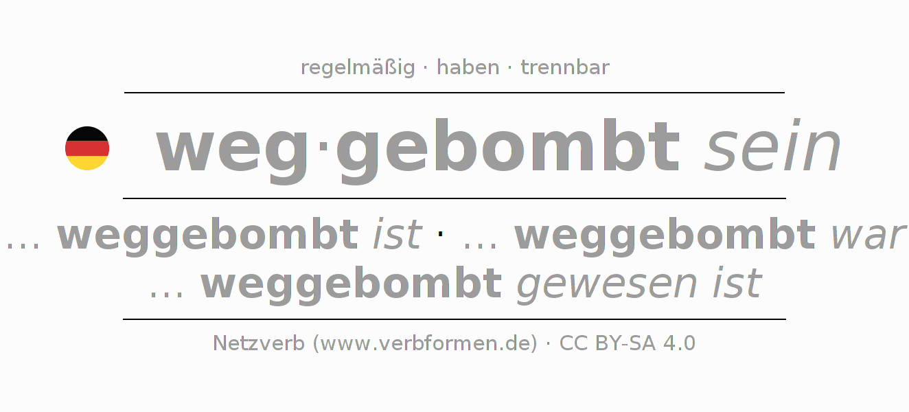 - Futur I: ... ich weggebombt sein werde, ... du weggebombt sein wirst, ... er weggebombt sein wird, ... wir weggebombt sein werden, ... ihr weggebombt sein werdet, ... sie weggebombt sein werden