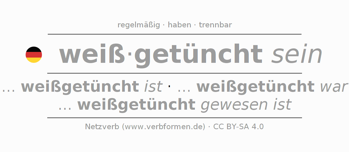 - Präsens: ... ich weißgetüncht bin, ... du weißgetüncht bist, ... er weißgetüncht ist, ... wir weißgetüncht sind, ... ihr weißgetüncht seid, ... sie weißgetüncht sind
