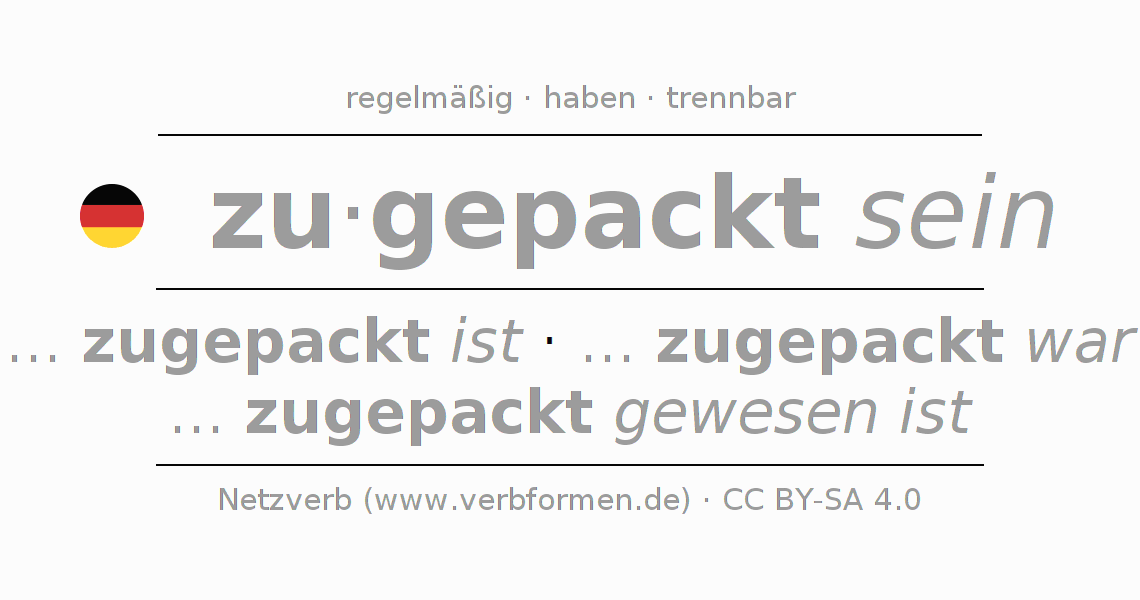 - Futur I: ... ich zugepackt sein werde, ... du zugepackt sein werdest, ... er zugepackt sein werde, ... wir zugepackt sein werden, ... ihr zugepackt sein werdet, ... sie zugepackt sein werden