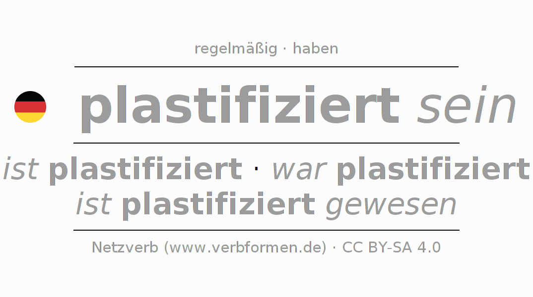 - Perfekt: ich bin plastifiziert gewesen, du bist plastifiziert gewesen, er ist plastifiziert gewesen, wir sind plastifiziert gewesen, ihr seid plastifiziert gewesen, sie sind plastifiziert gewesen