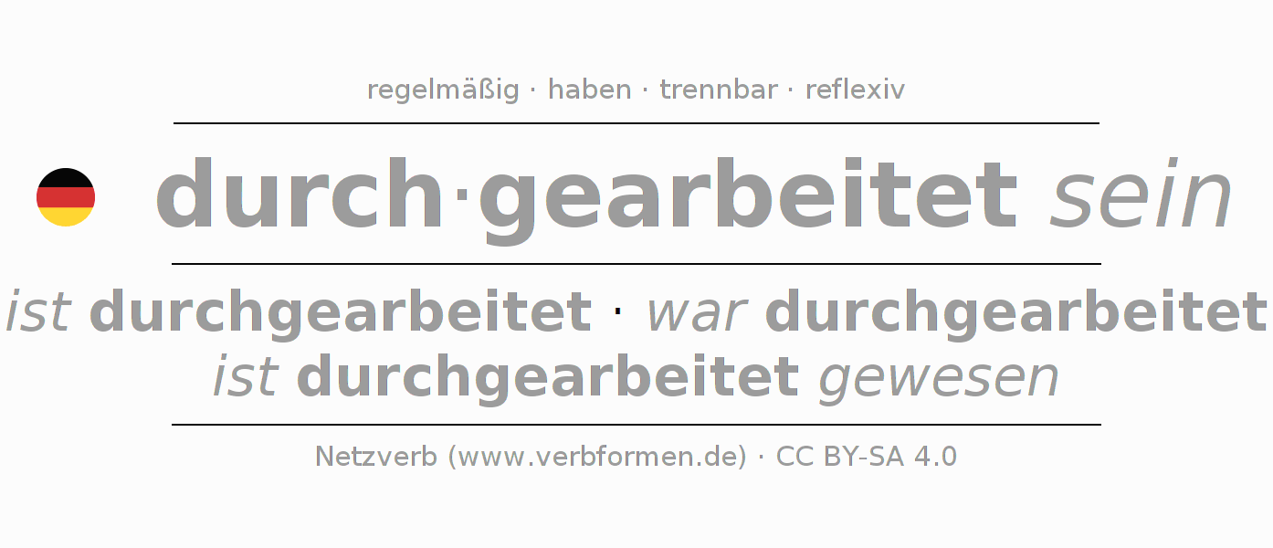 Die durch·gearbeitet sein Konjugation online als Verbtabelle mit allen Verbformen in Singular (Einzahl) und Plural (Mehrzahl) in allen Personen (1. Person, 2.Person, 3. Person) übersichtlich dargestellt. Die Beugung bzw. Flexion des Verbs durch·gearbeitet sein ist somit eine Hilfestellung für Hausaufgaben, Prüfungen, Klausuren, für den Deutschuntericht der Schule, zum Deutsch Lernen, für das Studium, Deutsch als Fremdsprache (DaZ), Deutsch als Zweitsprache (DaZ) und für die Erwachsenenbildung. Gerade auch für Deutschlernende ist die korrekte Konjugation des Verbs bzw. die korrekt flektierten Formen (ist durchgearbeitet - war durchgearbeitet - ist durchgearbeitet gewesen) entscheidend. Weitere Informationen finden sich unter Wiktionary durcharbeiten und unter durcharbeiten im Duden.