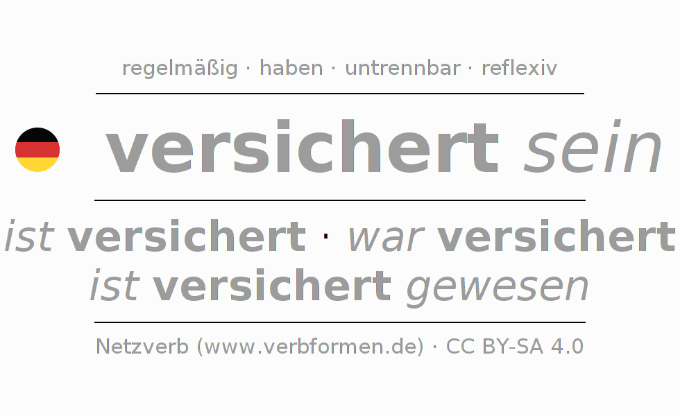 Die versichert sein Konjugation online als Verbtabelle mit allen Verbformen in Singular (Einzahl) und Plural (Mehrzahl) in allen Personen (1. Person, 2.Person, 3. Person) übersichtlich dargestellt. Die Beugung bzw. Flexion des Verbs versichert sein ist somit eine Hilfestellung für Hausaufgaben, Prüfungen, Klausuren, für den Deutschuntericht der Schule, zum Deutsch Lernen, für das Studium, Deutsch als Fremdsprache (DaZ), Deutsch als Zweitsprache (DaZ) und für die Erwachsenenbildung. Gerade auch für Deutschlernende ist die korrekte Konjugation des Verbs bzw. die korrekt flektierten Formen (ist versichert - war versichert - ist versichert gewesen) entscheidend. Weitere Informationen finden sich unter Wiktionary versichern und unter versichern im Duden.