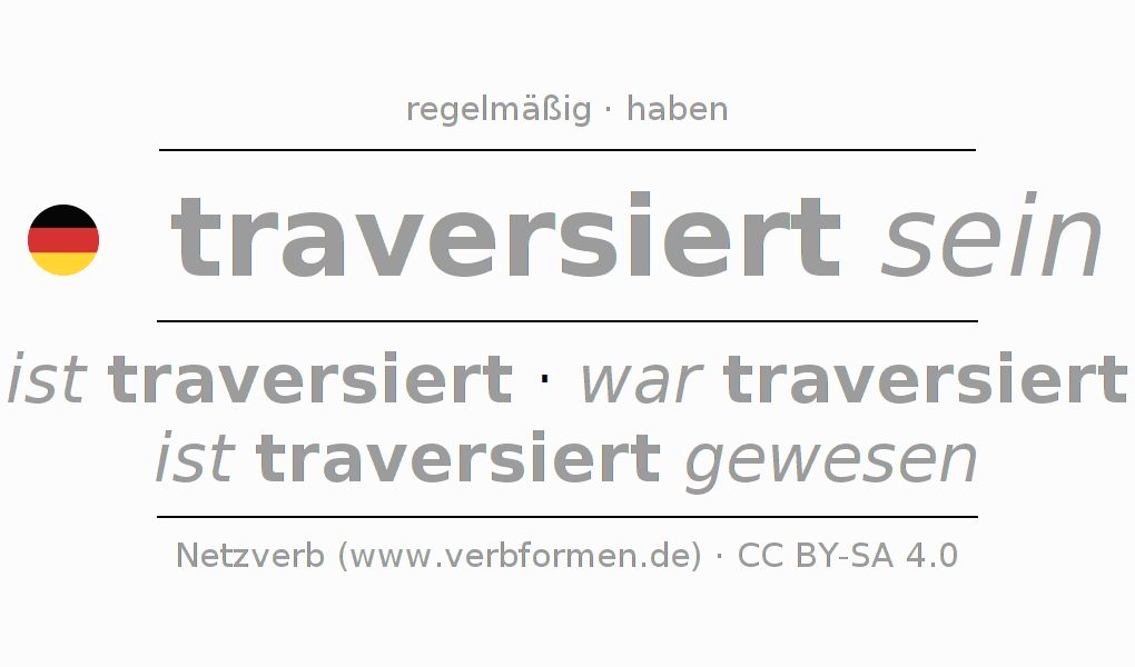 - Perfekt: ich bin traversiert gewesen, du bist traversiert gewesen, er ist traversiert gewesen, wir sind traversiert gewesen, ihr seid traversiert gewesen, sie sind traversiert gewesen