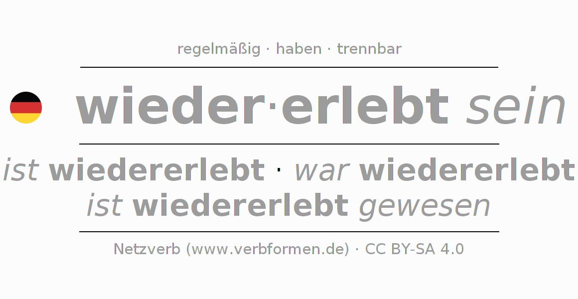 - Perfekt: ich bin wiedererlebt gewesen, du bist wiedererlebt gewesen, er ist wiedererlebt gewesen, wir sind wiedererlebt gewesen, ihr seid wiedererlebt gewesen, sie sind wiedererlebt gewesen