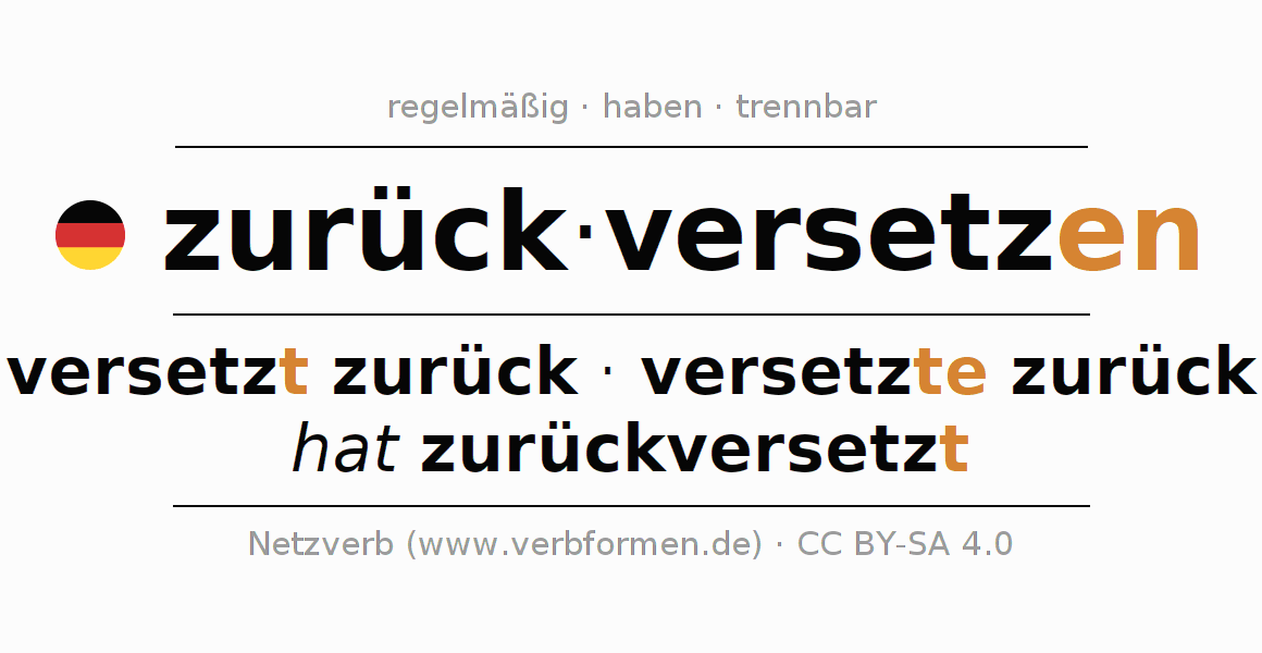 - Präsens: versetz(e) (du) zurück, versetzen wir zurück, versetzt (ihr) zurück, versetzen Sie zurück